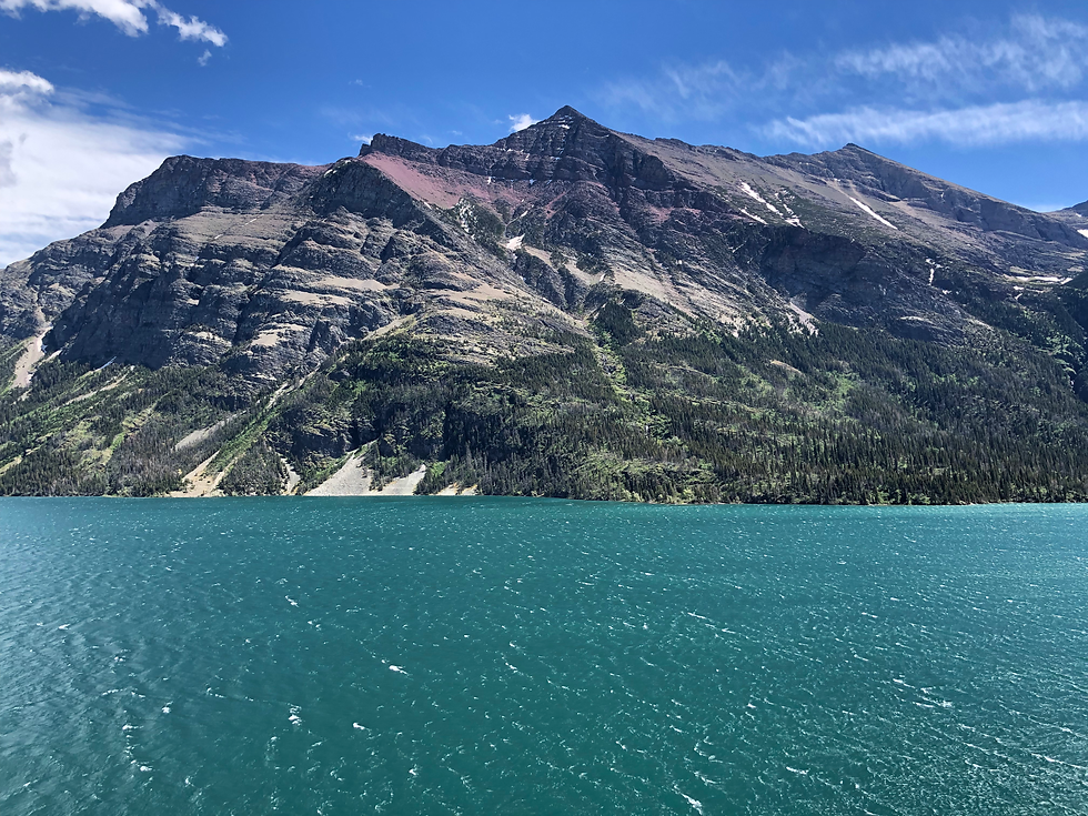 Approaching from the east through St. Mary opens everything up. St. Mary Lake runs broad beneath exposed slopes, with Wild Goose Island set forward in the water, close enough to anchor the view.